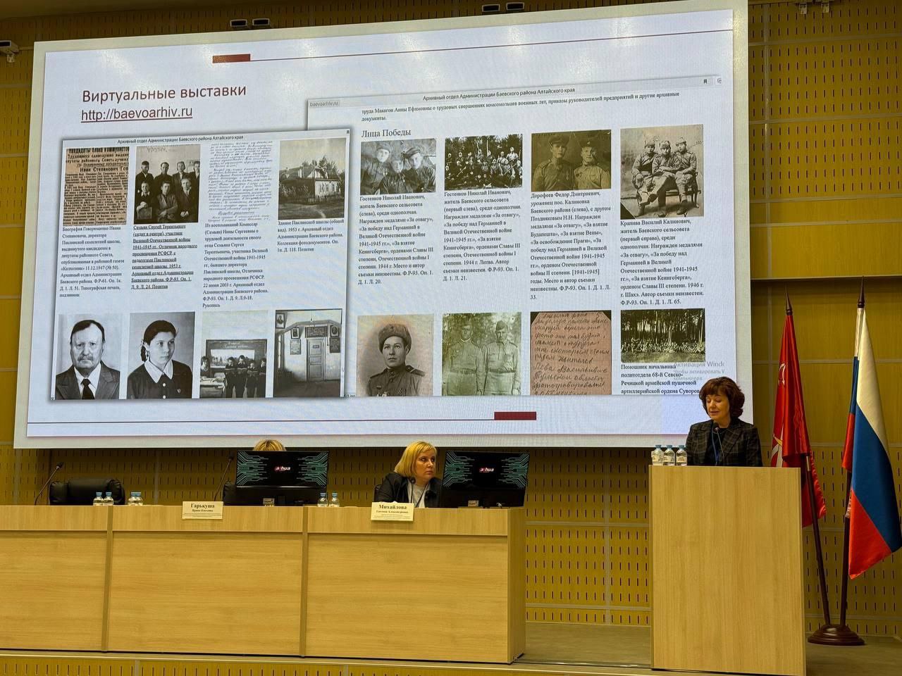 В своем докладе начальник архивного отдела рассказала о составе архивных коллекций по военной тематике, остановилась на опыте комплектования архива документами личного происхождения благодаря взаимодействию с населением и органами местного самоуправления, через проведение акции «Народный архив», информирование жителей посредством районной газеты, сайта архива, социальных сетей. Имеются положительные примеры привлечения личных архивов граждан для подготовки виртуальных выставок и проведения совместных мероприятий с учреждениями культуры и органом ЗАГС в Баевском районе.